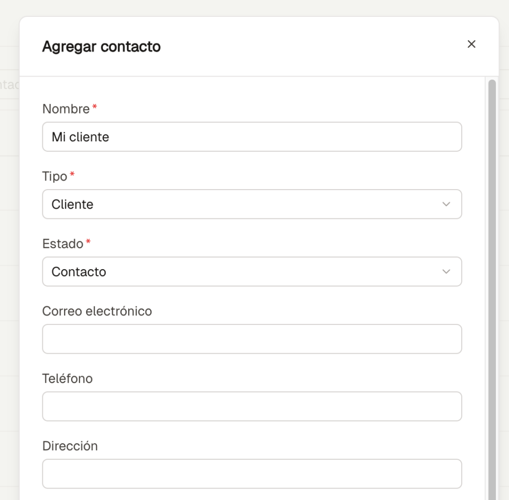 💡 Consejo: Asigna el tipo correcto al crear el contacto. Te permitirá filtrar y buscar más rápido.