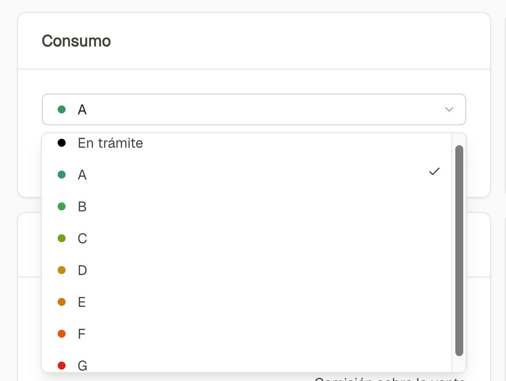 Añade la calificación energética de tu propiedad para cumplir con la normativa. La escala va de A (más eficiente) a G (menos eficiente).