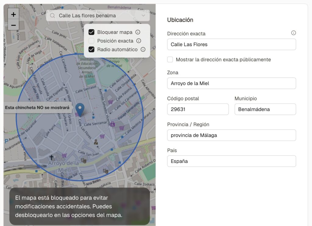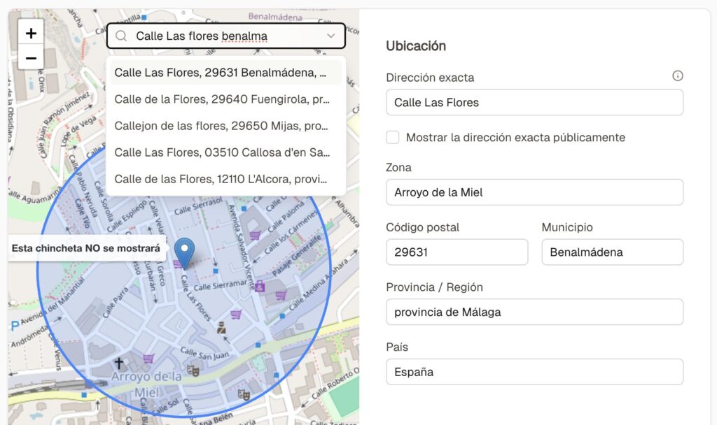 Si está activada, los visitantes ven el pin exacto en el mapa desde la web. Si está desactivada, ven un área aproximada (círculo azul).